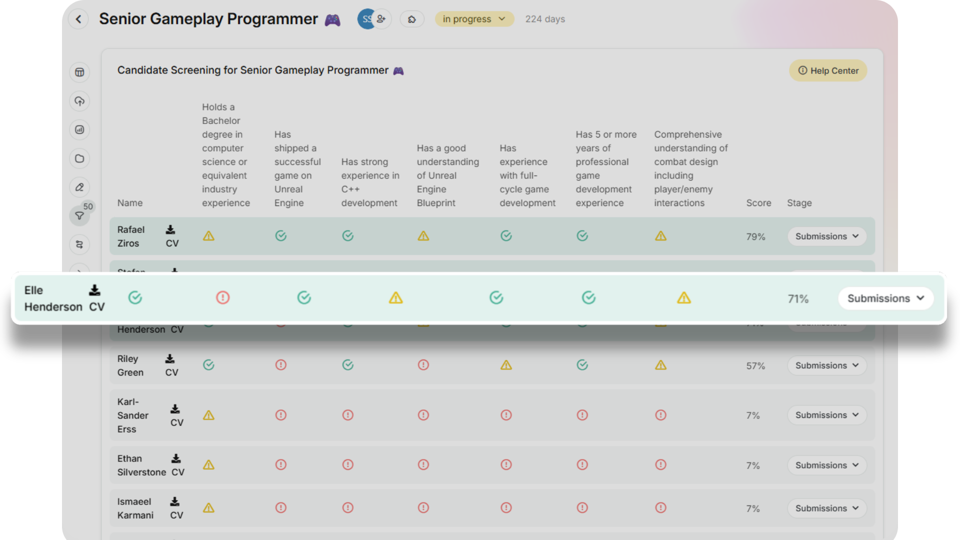 With the screener, your shortlist is ready in seconds but you remain in full control. The AI simply gives you the insights you need to make the final call.