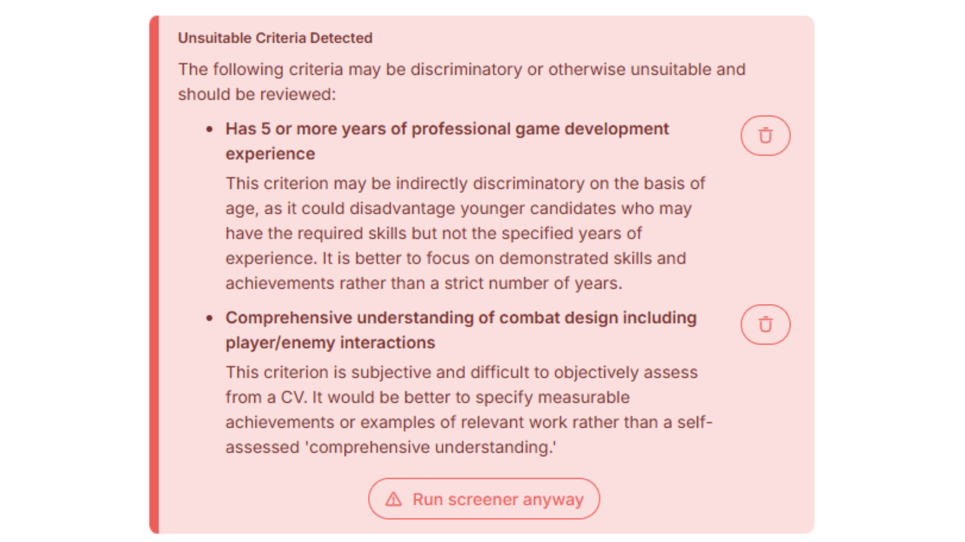 Teamdash’s screener is built on this principle. Our system’s internal logic excludes sensitive data and flags subjective filters automatically. It highlights potentially unsuitable or discriminatory criteria before the screening begins. For example, if a requirement like “5 or more years of experience” or “comprehensive understanding” is detected, the system alerts you that these might unintentionally create bias or be too subjective to measure.